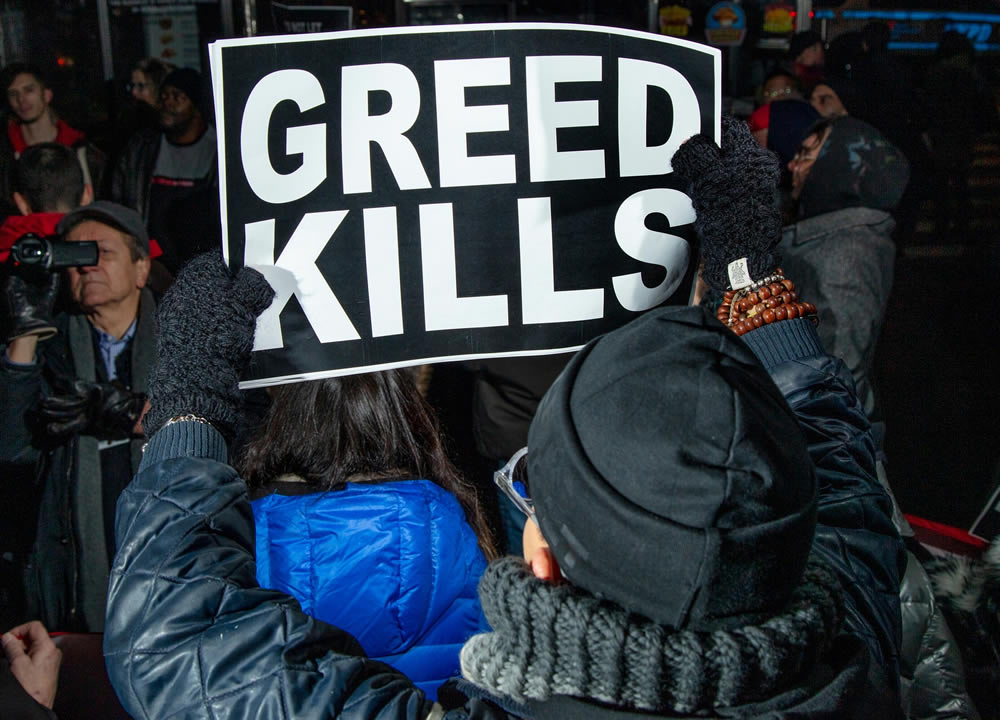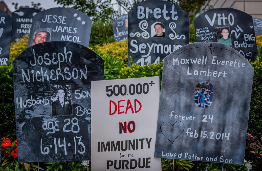 在破产法院周围,抗议者树立起了临时的墓碑。墓碑上的名字笑脸,是一个个在这场持续20年、人为操纵的阿片类药物滥用丑闻里因为药物过量而不幸逝去的生命。