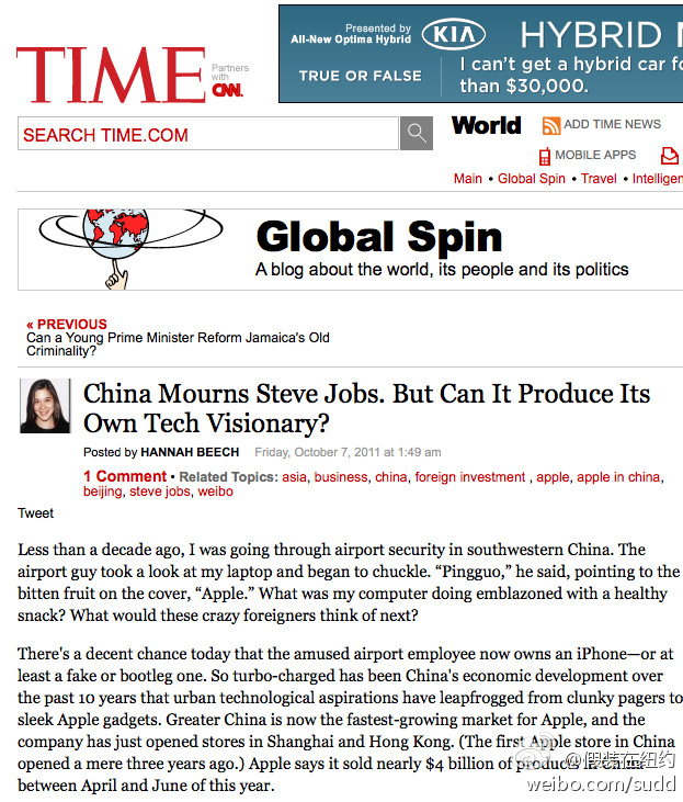 Time这篇文章描述了中国疯狂纪念乔布斯的场景之后说:
