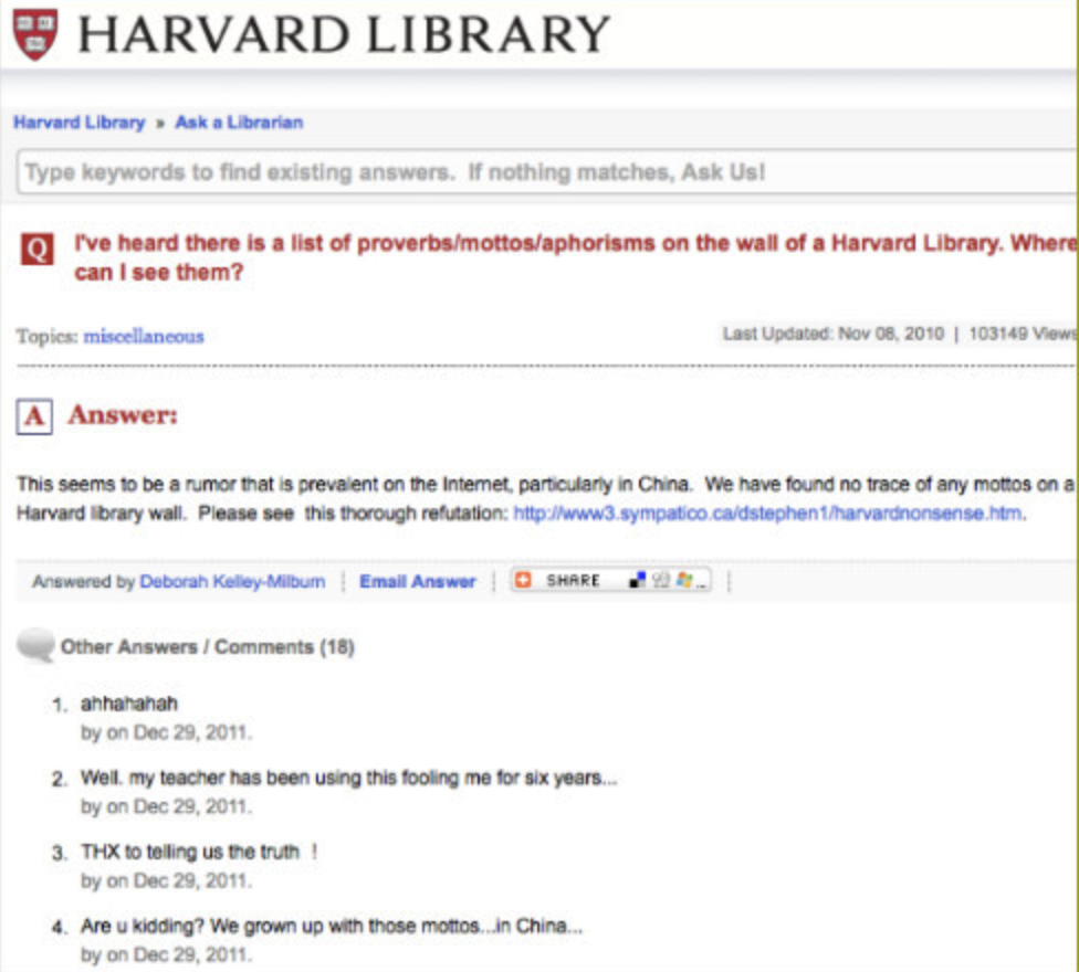 哈佛大学图书馆针对不断有中国学生来寻找所谓哈佛馆训 哈佛大学图书馆针对不断有中国学生来寻找所谓哈佛馆训,特地在网站上回应: 互联网、尤其是中国的互联网上流传的此类消息不实,哈佛图书馆任何一面墙上都没有刻着什么校训。 有苦逼的中国娃崩溃地留言:这是真的吗?我在中国可是听着这些名言长大的呀! 相关文章: 哥伦比亚大学的第一位总统 乔布斯的十大信条 乔布斯的iPhone 乔布斯和他从未谋面的生父