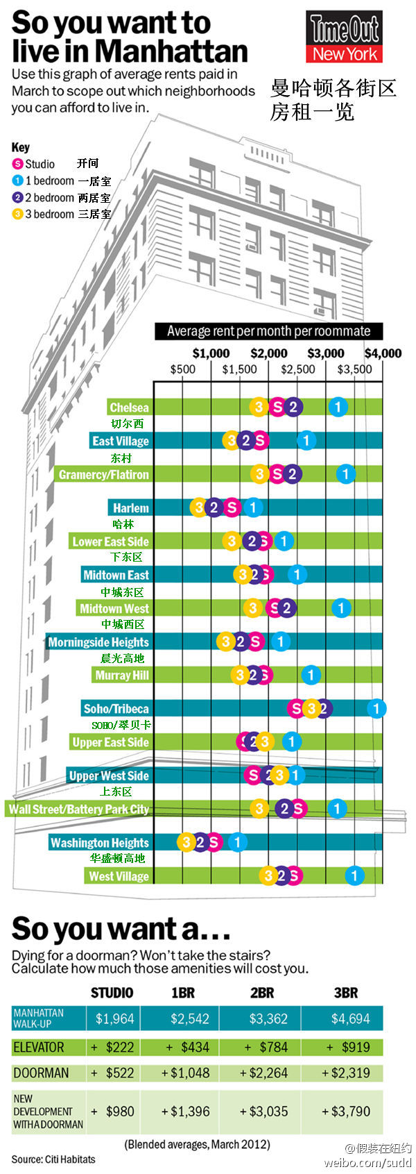 曼哈顿房价图 TimeOut杂志纽约版做的曼哈顿房价图。总体来说,曼哈顿的普通开间平均月租是1964美元,一居室2542美元,两居室3362美元,三居室4694美元。如果是有门童的公寓,普通开间月租2186美元,一居室2976美元,两居室4046美元,三居室5603美元。 相关文章: 战地记者玛丽·卡尔文叙利亚身亡 The Press Democrat纪念乔布斯的头版 迈阿密食人魔事件似乎越来越诡异了 Anderson Cooper刚刚正式宣布出柜