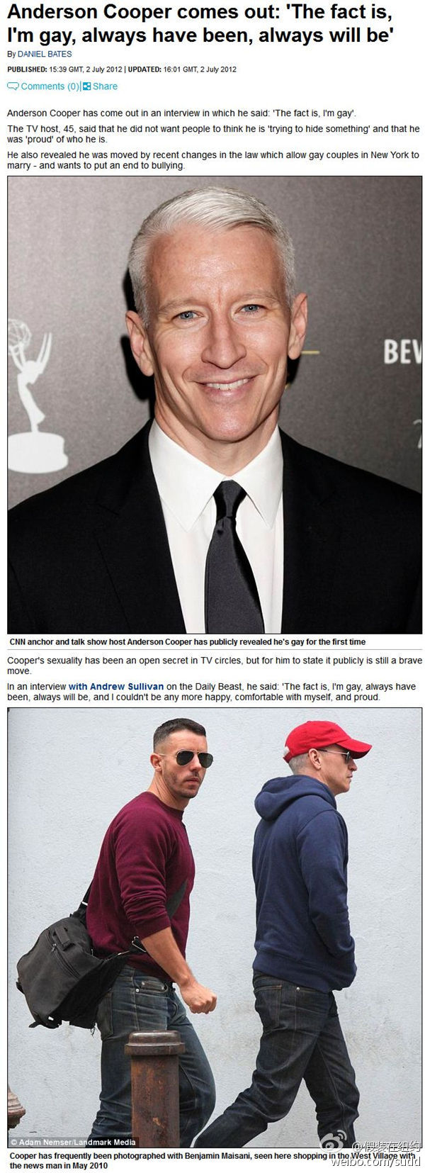 Anderson Cooper刚刚正式宣布出柜 Anderson Cooper刚刚正式宣布出柜。 相关文章: 一幅让纽约人愤怒的海报 寄出你的秘密 乔布斯的iPhone 任何一个公民都不应该因为表达自己对公共政策的看法而受到攻击。