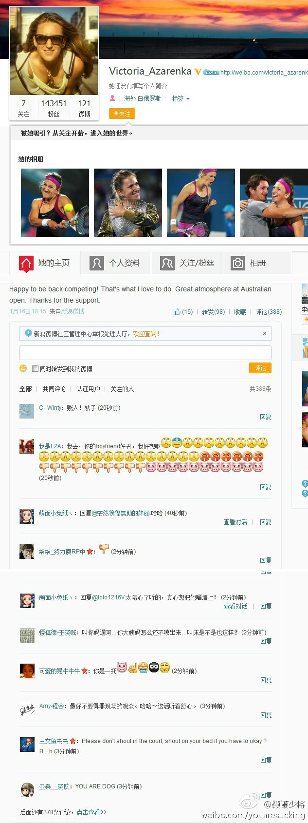 澳网女单决赛结束,打败李娜的阿扎伦卡哭成了泪人 澳网女单决赛结束,打败李娜的阿扎伦卡哭成了泪人。那一刻,我突然喜欢上了这个姑娘。那之前的24个小时,她经受了太多的煎熬。半决赛的伤停事件,让她被所有美国媒体口诛笔伐。决赛上,裁判,观众,都没有站在她这边。但她都经受住了。为李娜喝彩,也为打败李娜的阿扎喝彩。 相关文章: 中文互联网和英文互联网的又一个不同点 也许你碰到的陌生人就是一颗炸弹 什么时候有大量像村上春树那样描摹城市和现代人的文艺作品获得国际认可 70后80后应该感到庆幸