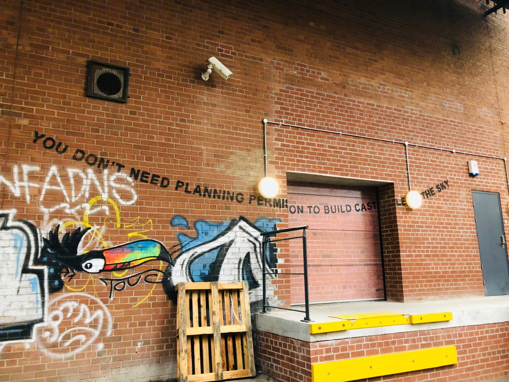 因为时间关系我只去找了两幅banksy的作品。其中第二幅只有一句话:you dont need planning permission to build castle on the sky,在一个小图书馆的墙角,旁边是几个垃圾桶。