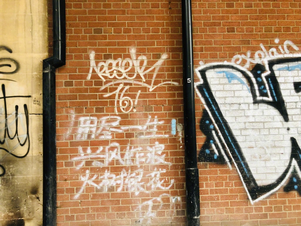 那句话旁边还有很多别的无名艺术家的涂鸦,意外看到了几行中文:用尽一生、兴风作浪、火树银花。