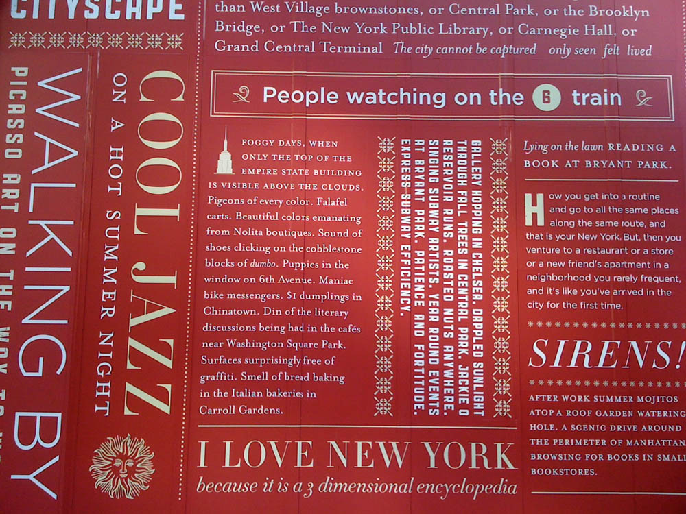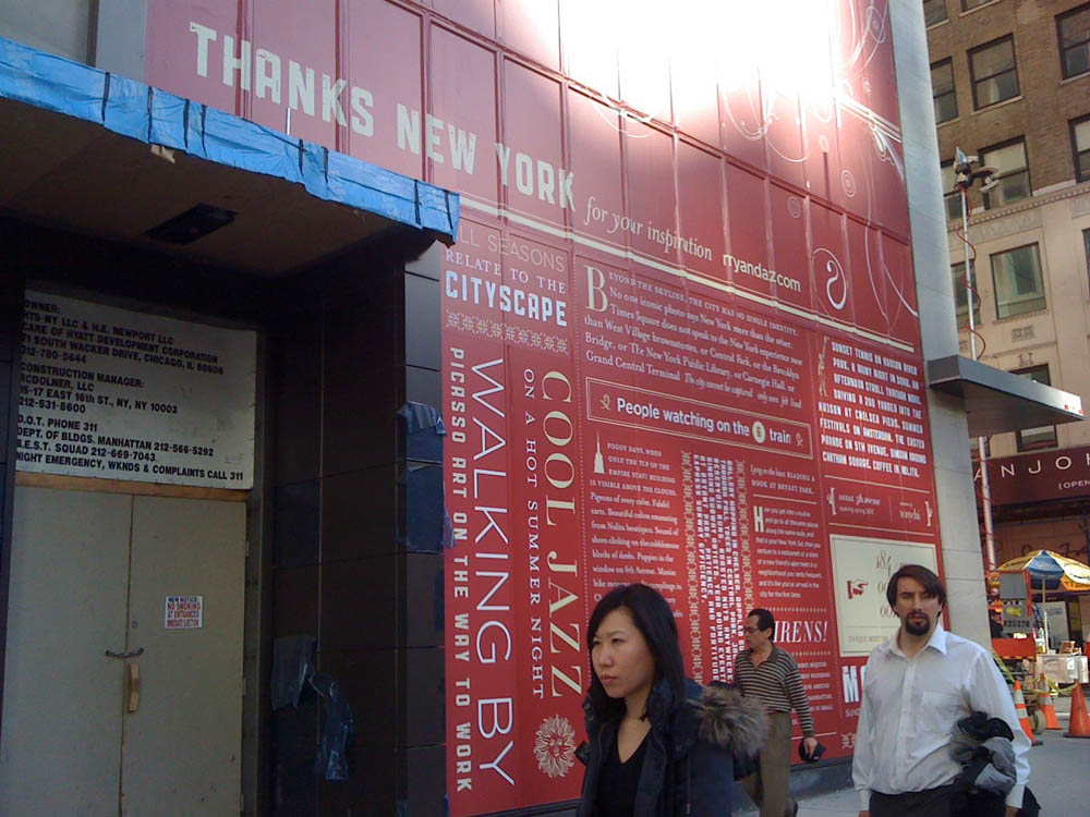 Thanks New York, for your inspiration 这是Bryant Park对面一家正在装修还没开业的新酒店临街墙面的临时装饰,酒店的名称叫Andaz。 他们的网站上说,andaz是印度语,意思是personal style。 再查了一下,发现原来是Hyatt旗下由David Rockwell创办的最新酒店品牌。目前全世界一共有5家Andaz。除了五大道即将开业的这家和今年早些时候刚刚开业的华尔街店,还有三家分别在加州West Hollywood、加州San Diego和英国伦敦。 相关文章: 午夜的曼哈顿是一个巨大的游乐场。 纽约有多国际化 在日落前来到了布鲁克林 纽约每一条地铁上的人都气质分明
