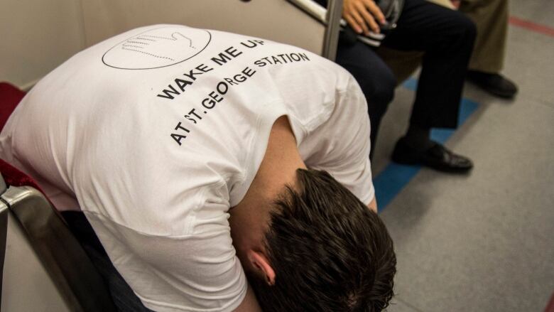 这件T裇衫的背面上写着“Wake me up at St. George Station (请在圣乔治站叫醒我)”。穿着这件衣服在地铁上打瞌睡时,旁边好心的乘客就会知道,到了多伦多大学所在的圣乔治城站应该举起手,在这个可怜的缺觉的孩子背上,duang一下,拍醒他。
