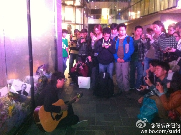 三里屯苹果店门口,有人在唱歌纪念乔布斯。
